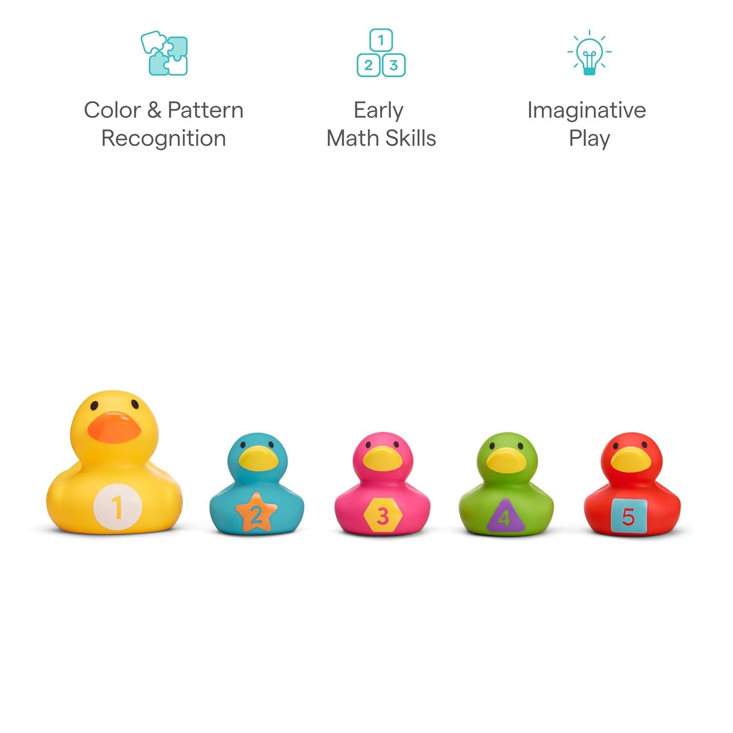 Adorable, educational bath toy set with 1 mama duck and 4 baby ducklings in bright, engaging colors